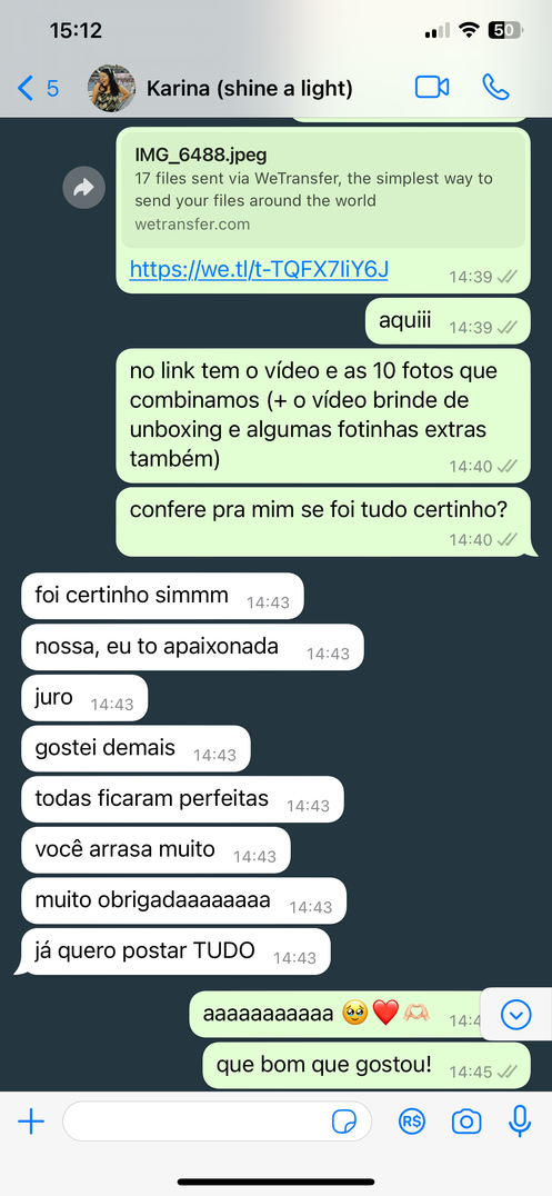envio todo o material em vídeo e foto via link do We Transfer, para aguardar a aprovação da marca